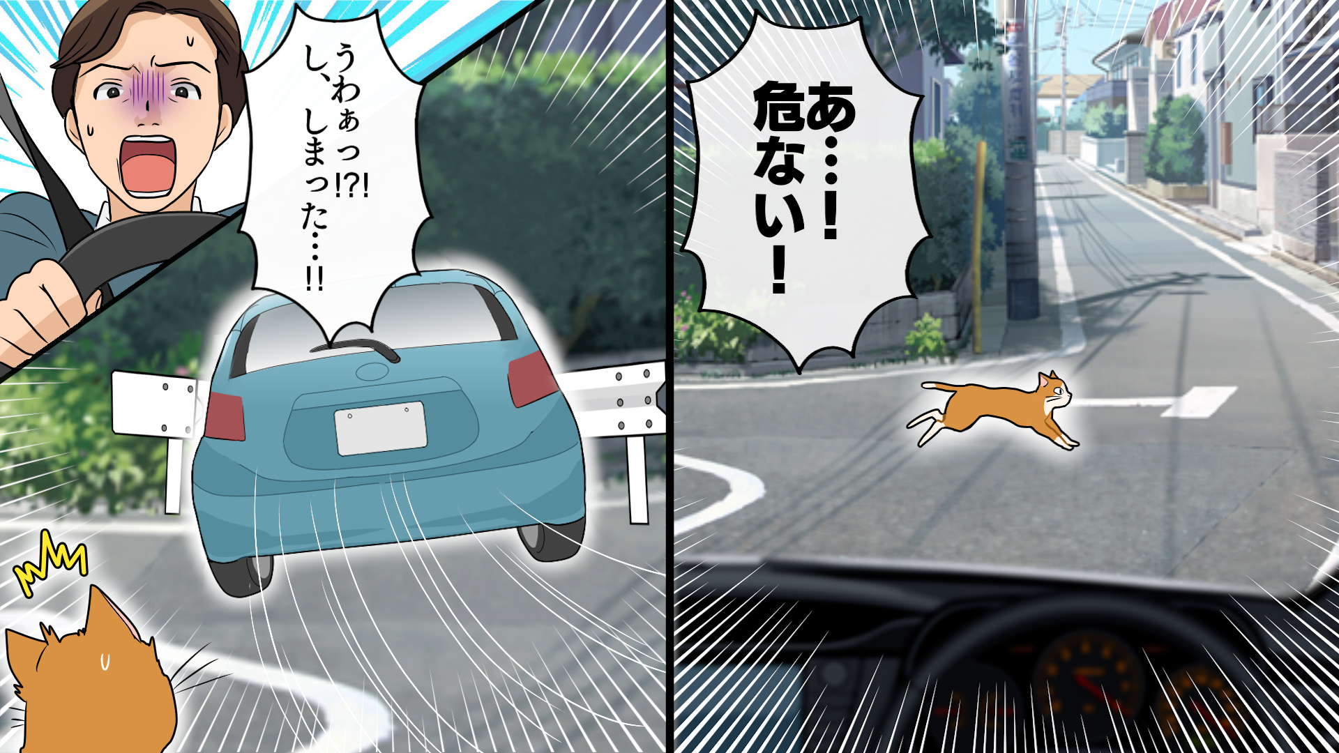 穏やかなドライブ中、不運にも自損事故を起こしてしまった主人公。